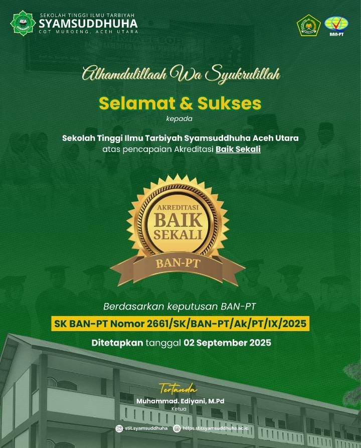 Aceh Utara – Sekolah Tinggi Ilmu Tarbiyah (STIT) Syamsuddhuha Aceh Utara kembali menorehkan prestasi membanggakan di dunia pendidikan tinggi. Berdasarkan keputusan Badan Akreditasi Nasional Perguruan Tinggi (BAN-PT) dengan Nomor SK 2661/SK/BAN-PT/Ak/PT/IX/2025 Tanggal 02 September 2025, STIT Syamsuddhuha resmi meraih Akreditasi Baik Sekali.