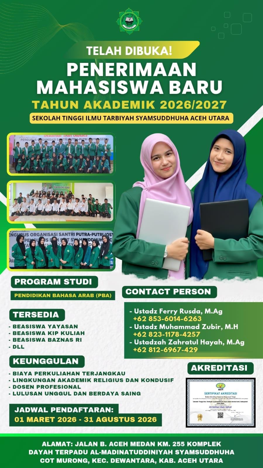 Sekolah Tinggi Ilmu Tarbiyah (STIT) Syamsuddhuha Aceh Utara secara resmi membuka Penerimaan Mahasiswa Baru (PMB) untuk Tahun Akademik 2026/2027. Kesempatan ini terbuka bagi para lulusan SMA/sederajat yang ingin melanjutkan pendidikan tinggi dalam lingkungan akademik yang religius, kondusif, dan berkualitas.
